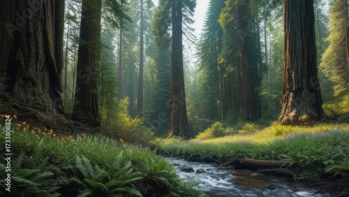 © fathul, Obraz premium Sunlit stream flows through a lush redwood forest