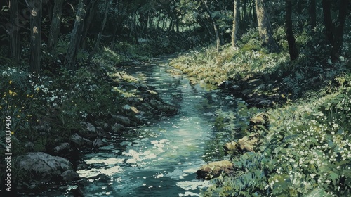 © Zam, Obraz premium Sunlit stream flows through lush green forest. (3)