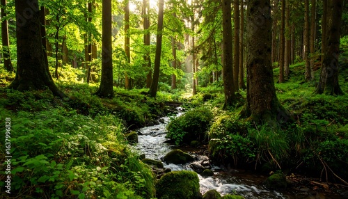 © tola, Obraz premium Sunlit stream flows through lush green forest