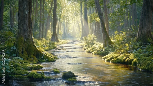 © Rere_Art151, Obraz premium Sunlit Stream Flows Through Mossy Forest