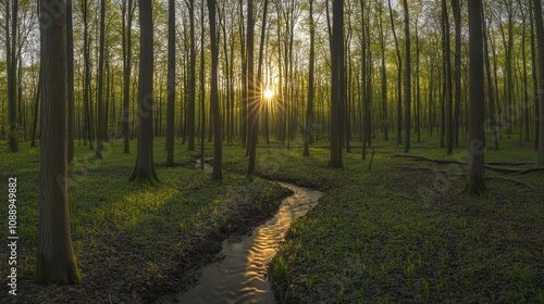 © makappa, Fototapeta premium Sunlit stream flows through spring forest.