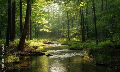 © jambulart, Obraz premium Sunlit stream flows through verdant forest.