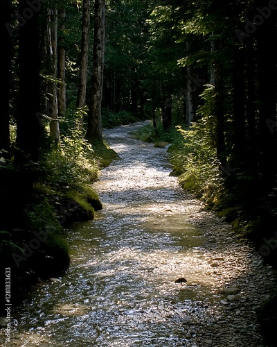 © Cintia, Obraz premium Sunlit stream, forest path, nature scene, tranquility