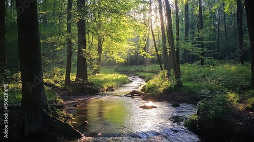 © Masjid, Fototapeta premium Sunlit Stream in a Lush Forest: A Serene Escape