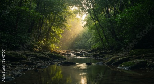 © AlifBastyawan, Fototapeta premium Sunlit Stream in Lush Green Forest
