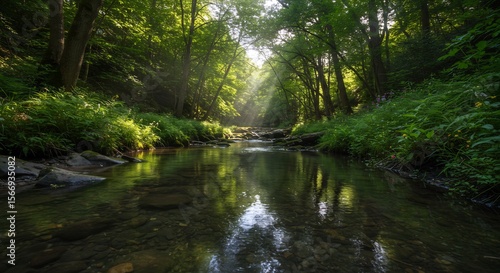 Fototapeta premium Sunlit Stream Through Lush Green Forest, Tranquil Water Reflection, Serene...