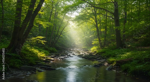 © Tri, Fototapeta premium Sunlit Stream Winding Through Lush Green Forest