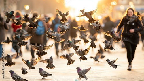 © jirasin, Fototapeta premium Sunlit Street Scene with Flying Pigeons and People Walking