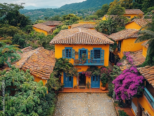 Obraz premium Sunlit Streets of Santa Fe de Antioquia Showcasing Colonial Architecture and...