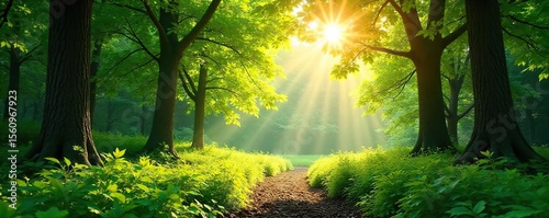 Obraz premium Sunlit Summer Forest Tranquil Green Canopy, Dappled Light Illuminates Lush...
