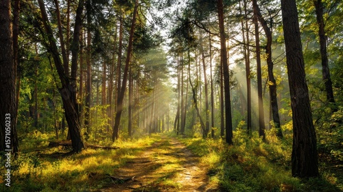 Obraz premium Sunlit summer pine forest with golden rays breaking through dense green