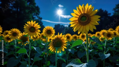 © Kritsana, Fototapeta premium Sunlit Sunflower Field, Vibrant Yellow Blossoms Basking in Golden Hour Light, Tall Stalks Reaching for the Sun