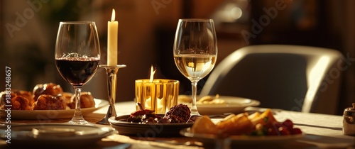 © vxnaghiyev, Fototapeta premium Sunlit table with a candle and display of red and white wine glasses