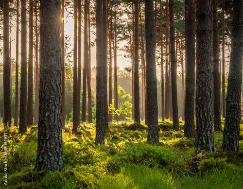 © bom, Fototapeta premium Sunlit, tall trees in a vibrant forest, illuminating lush green foliage