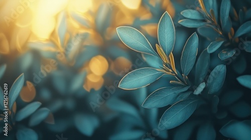 Fototapeta premium Sunlit teal leaves glow at sunset in a garden