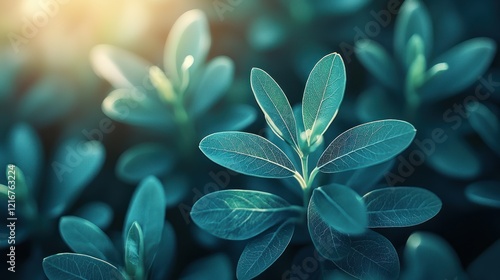 Fototapeta premium Sunlit teal leaves thriving in a dense garden background, ideal for nature themes