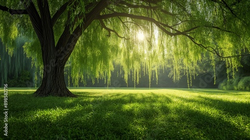 © QuietWord, Fototapeta premium sunlit through willow tree branch beautiful nature background wallpaper