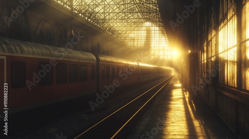 © ABIDZAR ALFAREZ, Fototapeta premium Sunlit train at vintage railway station platform.