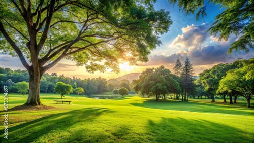 Obraz premium Sunlit Tree Canopy Over Golf Course with Bench and Pond