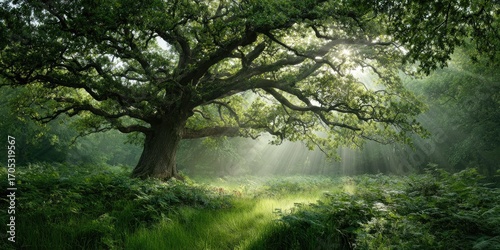 © Tutup, Obraz premium Sunlit Tree in Verdant Meadow