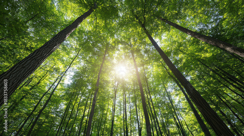Naklejka premium Sunlit treetops forest sunlight canopy green leaves tall trees sunbeam woodland