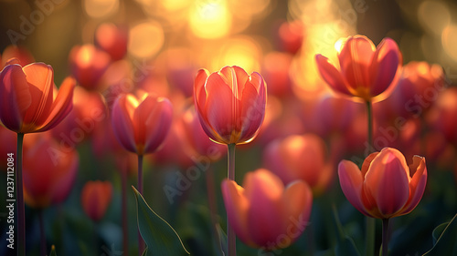 Fototapeta premium Sunlit tulip blooms in Skagit Valley during springtime magic