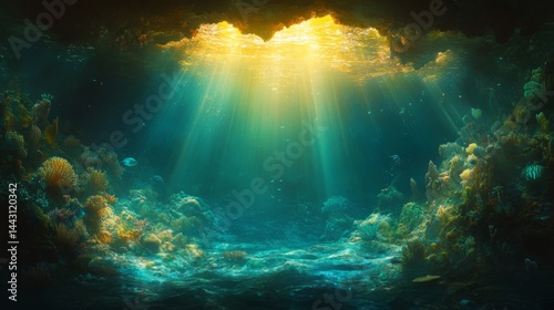 © LintanAmalliyah, Fototapeta premium Sunlit Underwater Cave With Green And Gold Coral