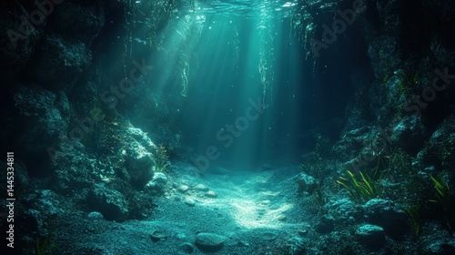 Naklejka premium Sunlit underwater cave with lush vegetation and ethereal blue glow