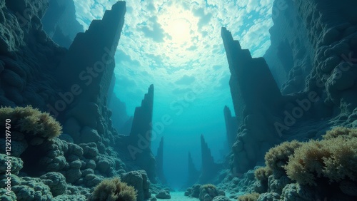 © Xavi, Fototapeta premium Sunlit underwater coral canyon showing bleaching and climate change effects