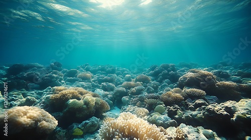 Naklejka premium Sunlit Underwater Coral Reef Scene Showing Vibrant Life