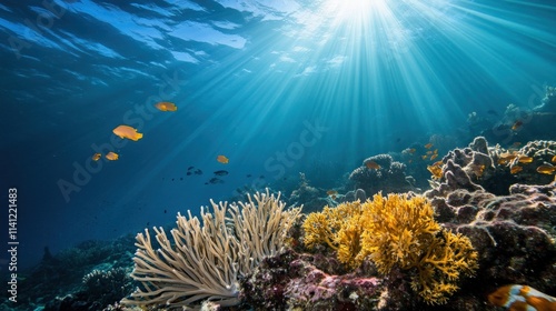 © berkah nikah, Fototapeta premium Sunlit Underwater Coral Reef Scene With Fish