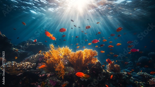 Fototapeta premium Sunlit Underwater Coral Reef Scene With Vibrant Fish