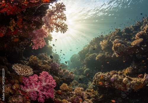Fototapeta premium Sunlit underwater coral reef with diverse marine life and vibrant colors