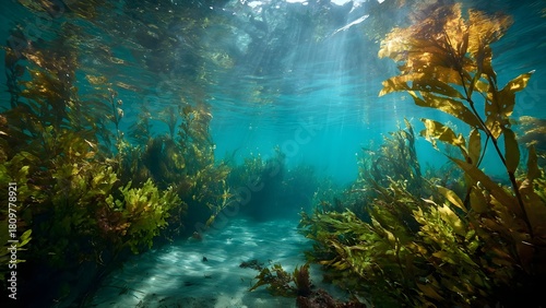 Fototapeta premium Sunlit Underwater Kelp Forest a Vibrant Marine Ecosystem with Shimmering Light