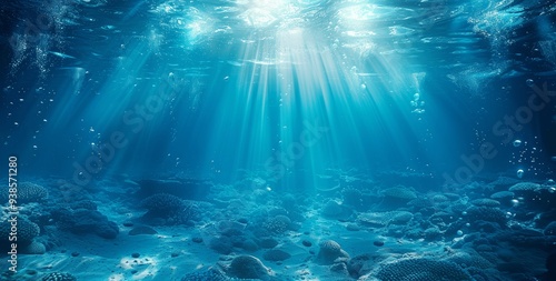 Fototapeta premium Sunlit Underwater Scene with Blue Ocean Floor and Bubbles