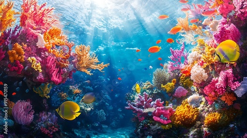 Naklejka premium Sunlit Underwater Scene with Vibrant Coral Reef and Fish