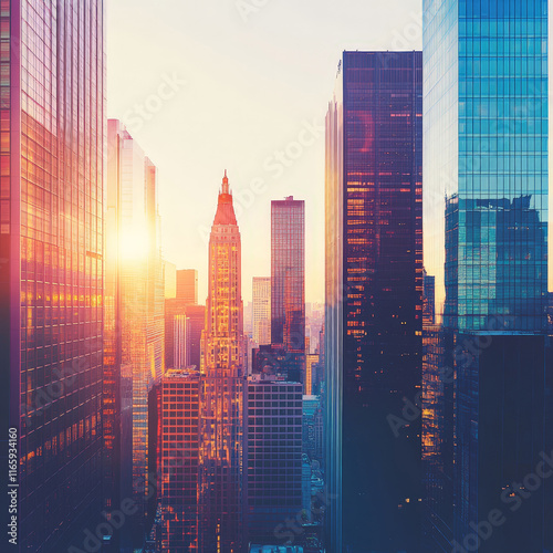 © tl6781, Fototapeta premium Sunlit urban skyline with tall modern skyscrapers reflecting a warm sunset glow, creating a striking mix of architecture and colors. The scene conveys vibrancy, city life, and modern urban design