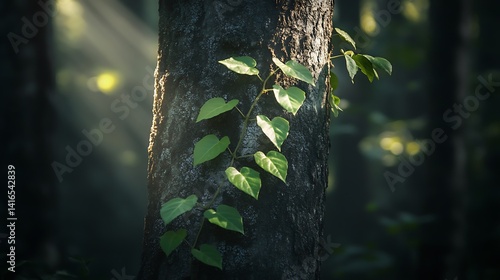 © zerogami, Obraz premium Sunlit Vine on Forest Tree Trunk