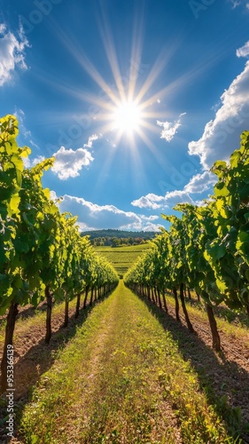 Fototapeta premium Sunlit Vineyard Landscape, a vibrant scene of lush grapevines stretching across rolling hills, bathed in golden sunlight, evoking tranquility and the promise of fine wine.
