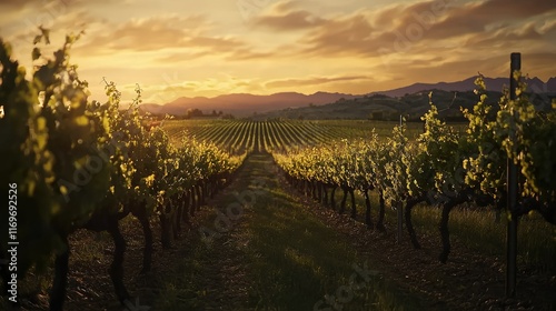 Naklejka premium Sunlit Vineyard Landscape with Lush Green Grapevines at Dusk
