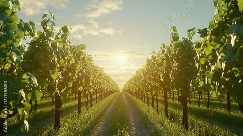 © yogiandrias, Naklejka premium Sunlit Vineyard Rows At Golden Hour