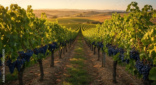 © komori, Fototapeta premium Sunlit Vineyard: Rows of grapevines stretch across a serene landscape.