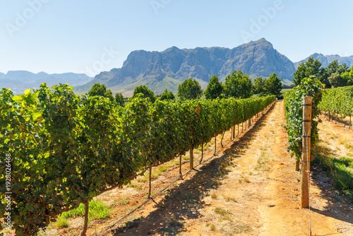 Naklejka premium Sunlit vineyard rows with mountain backdrop