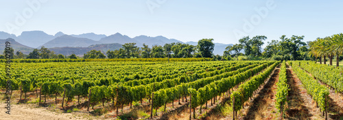 Fototapeta premium Sunlit vineyard rows with mountain backdrop
