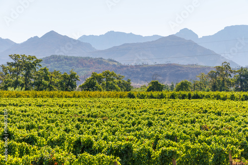 Fototapeta premium Sunlit vineyard rows with mountain backdrop