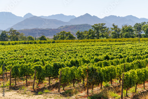 Fototapeta premium Sunlit vineyard rows with mountain backdrop