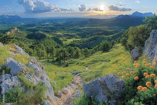 © nurdesign99, Fototapeta premium Sunlit Vista, Mountain Meadow Path at Dusk Overlooking Lush Valley