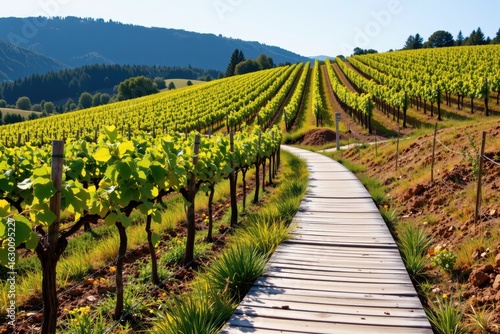 © phurinee, Fototapeta premium Sunlit Walkway Through a Lush Vineyard Landscape in Warm Weather