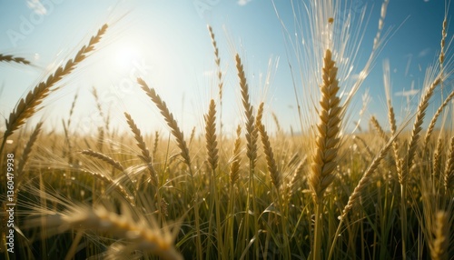 © Kitta Studio, Obraz premium Sunlit Wheat Field Under a Clear Blue Sky at Golden Hour