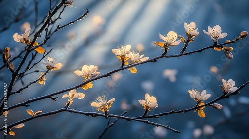 © HATO PROJECT, Fototapeta premium Sunlit white blossoms on a branch.